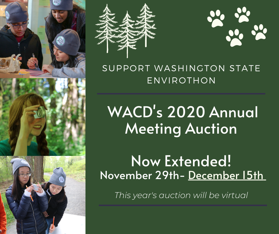 Each year, item donations are needed for the Washington State Envirothon Auction at the Washington Association of Conservation District (WACD) Annual Meeting. Items such as gift certificates, signed memorabilia, event tickets, outdoor gear, themed baskets, etc. are welcome donations.